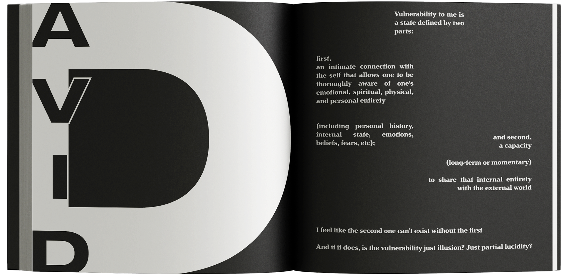 I asked 23 friends ——one for each letter of the alphabet, minus a few — what vulnerability meant to them, often putting myself in awkward and vulnerable positions to do so.